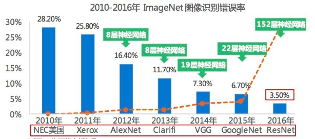 技術(shù)驅(qū)動(dòng)階段集中誕生了基礎(chǔ)理論、基本規(guī)則和基本開(kāi)發(fā)工具。在此階段,算法和計(jì)算力對(duì)AI的發(fā)展起到主要推動(dòng)作用?,F(xiàn)在主流應(yīng)用的基于多層網(wǎng)絡(luò)神經(jīng)的深度算法,一方面不斷加強(qiáng)從海據(jù)庫(kù)中自行歸納物體特征的能力,一方面不斷加強(qiáng)對(duì)新事物多層特征提取、描述和還原的能力。對(duì)算法來(lái)說(shuō),歸納和演繹同樣重要,最終目的是提高識(shí)別效率。最新ImageNet測(cè)試結(jié)果顯示,AI錯(cuò)誤率低達(dá)3.5% ,而人類(lèi)對(duì)同一數(shù)據(jù)庫(kù)識(shí)別錯(cuò)誤率在5.1%,理想情況下,計(jì)算機(jī)圖像識(shí)別能力已超越人類(lèi)。
